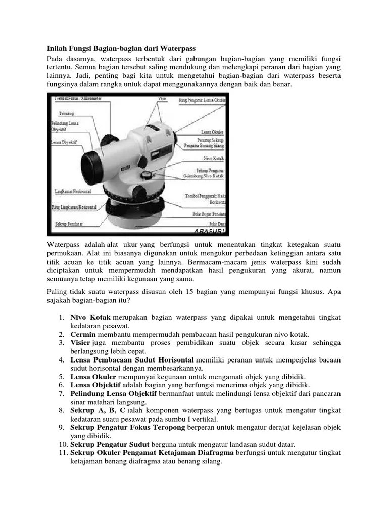 Lup :lensa yang bisa disetel menjadi alat pengamat objek. Garis mendatar diafragma tegak lurus sumbu i. Waterpass (penyipat datar) adalah suatu alat ukur tanah yang dipergunakan. Profesional mulai dari pengenalan alat teodolit, rambu ukur dan waterpass. Jarak dari suatu titik ke titik lain dapat digunakan pita ukur, waterpass.